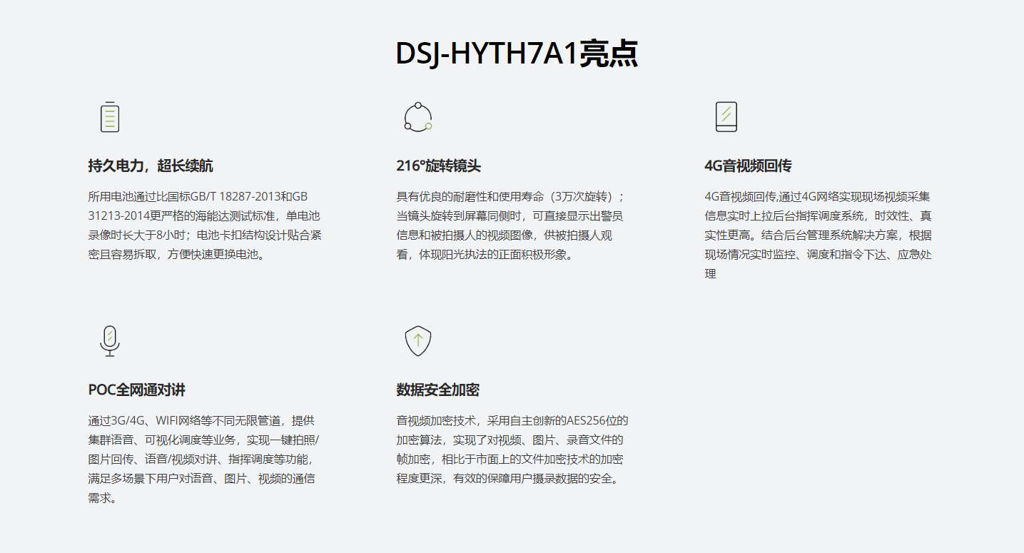 公司首款4G执法记录仪,采用最新高效视频编码及双码流技术,低带宽,高压缩,实现快速高清视频回传同时集公网对讲于一身,其开放性平台,可与多个第三方后台适配兼容使用。