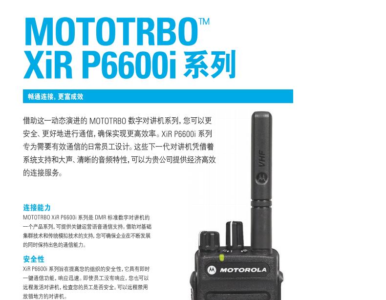 MOTOTRBO XiR P6600i 系列是 DMR 标准数字对讲机的一个产品系列,可提供关键运营语音通信支持。借助对基础集群技术和传统模拟技术的支持,您可确保企业在不断发展的同时保持出色的通信能力。