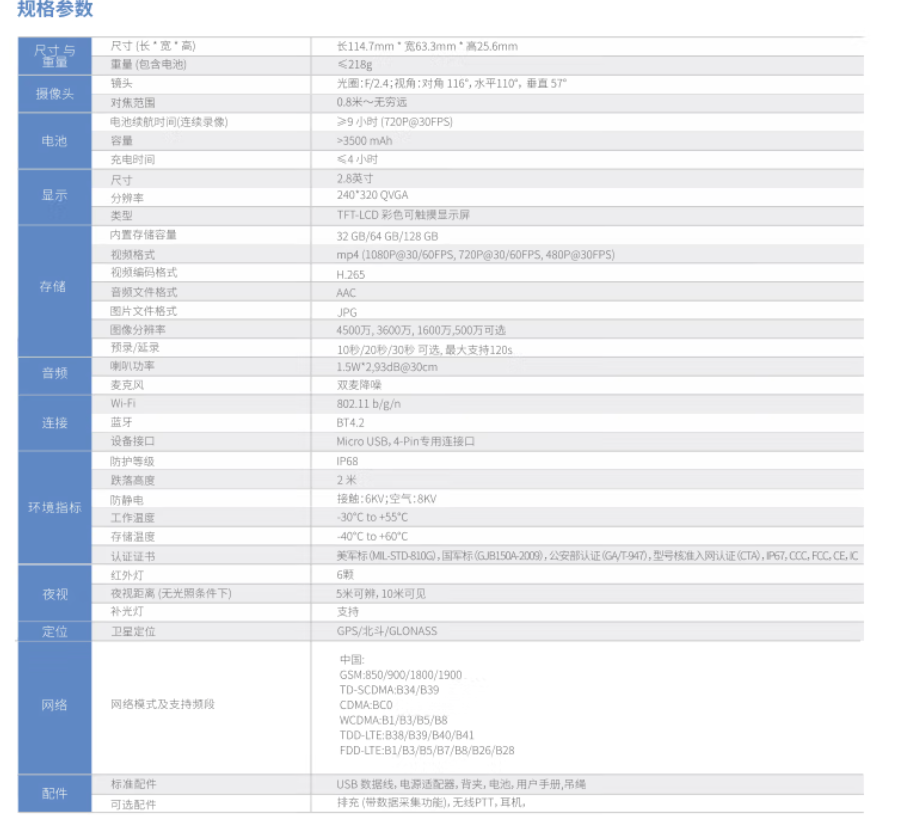 公司首款4G执法记录仪,采用最新高效视频编码及双码流技术,低带宽,高压缩,实现快速高清视频回传同时集公网对讲于一身,其开放性平台,可与多个第三方后台适配兼容使用。