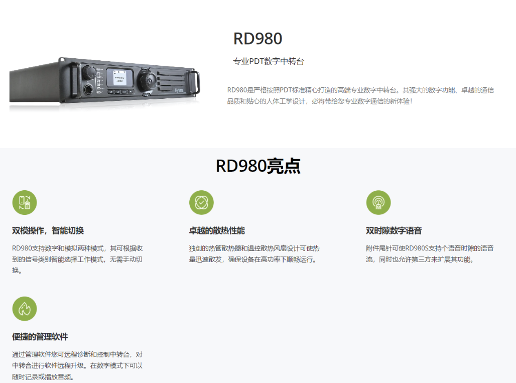 RD980是严格按照PDT标准精心打造的高端专业数字中转台。其强大的数字功能、卓越的通信品质和贴心的人体工学设计,必将带给您专业数字通信的新体验